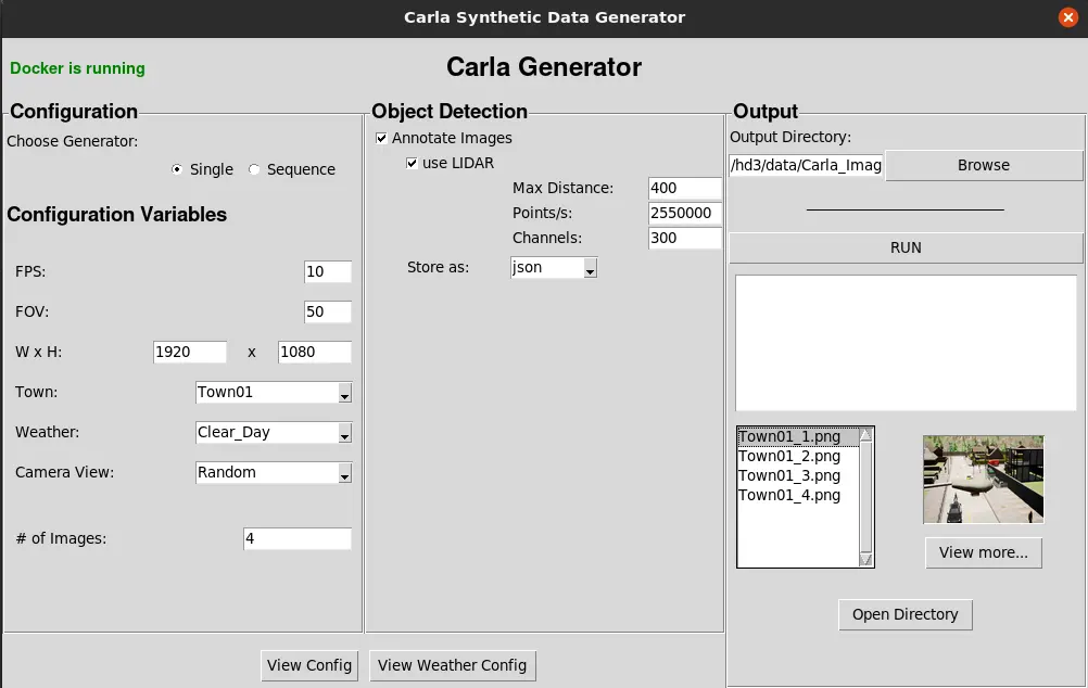 I developed a Python Tkinter tool to interact with the simulator, allowing configurable image capture, including sequential frames for video-based datasets.